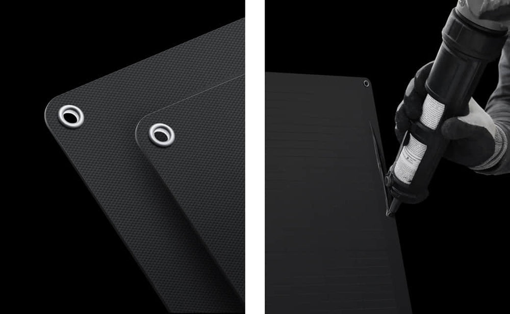 Os orifícios pré-cortados permitem que o painel solar flexível seja pendurado com ganchos ou fixado firmemente a uma superfície com um adesivo.