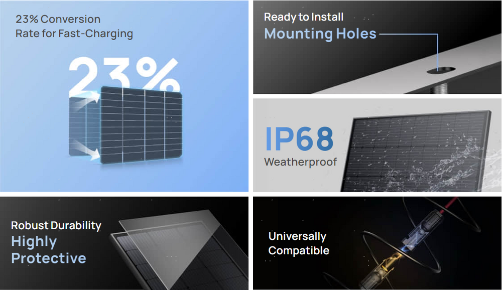 O nosso painel solar rígido de 100W tem uma excelente taxa de conversão de 23%, permitindo-te carregar ainda mais depressa. Usa-o como parte do teu sistema Power Kits ou com uma estação de energia portátil EcoFlow, e o algoritmo MPPT integrado otimiza a captação de energia solar.