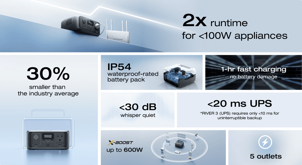 A RIVER 3 mantém 90% dos teus aparelhos essenciais a funcionar sem problemas com 300W de potência. Com a tecnologia X-Boost, consegue alimentar dispositivos de aquecimento de 600W sem dificuldade.