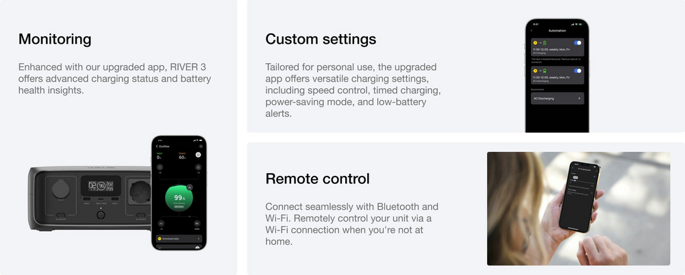 Com o inovador X-GaNPower, a RIVER 3 aproveita uma eficiência energética superior para prolongar o tempo de funcionamento de dispositivos de baixa voltagem com um design compacto e um volume de funcionamento mais silencioso