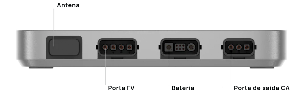 Luz vermelha intermitente: “falha interna”.Luz amarela intermitente: “falha externa”.Luz púrpura intermitente: “atualização em curso”.Luz azul intermitente: “ligação à rede”.Luz verde a respirar: indica que “a saída CA do microinversor está ligada à ficha inteligente”.Luz verde a respirar: indica que “a saída CA do microinversor está ligada à ficha inteligente”.Luz branca a respirar: indica que “a saída CA do microinversor não está ligada à ficha inteligente”. Luz verde constantemente acesa: indica que “a saída CA do microinversor não está ligada à Tomada Inteligente”.Luz branca a respirar: indica que “o microinversor não tem saída CA, mas está a carregar a bateria”.Luz branca constantemente acesa: “alimentação ligada, sem saída CA e sem carregamento da bateria”.