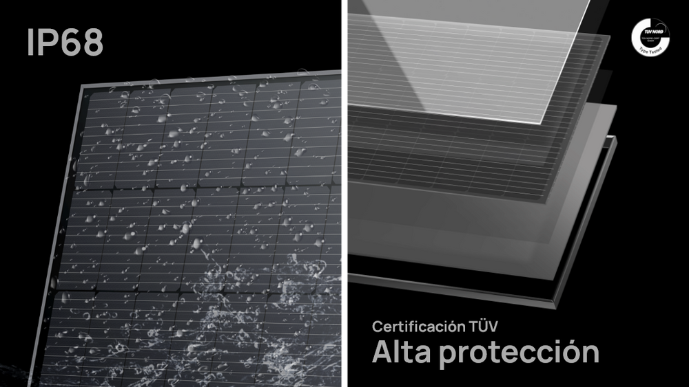 *A resistência à água e ao pó foi testada em condições laboratoriais controladas com uma classificação IP68 de acordo com a norma IEC 60529 (profundidade máxima de água de 1 metro até 72 horas). *Os painéis solares corretamente montados podem suportar uma carga dinâmica de pressão do vento de 2400pa (com ventos de 130 mph/209 km/h) e uma carga estática de neve de 5400pa (113 lb por pé quadrado/551 kg por metro quadrado de neve).