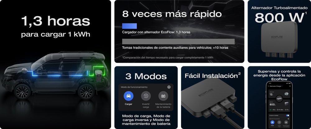 Carrega 8 vezes mais depressa enquanto conduzes com o nosso carregador de alternador EcoFlow de 800 W e recarrega a tua estação de energia em apenas 1,3 horas.