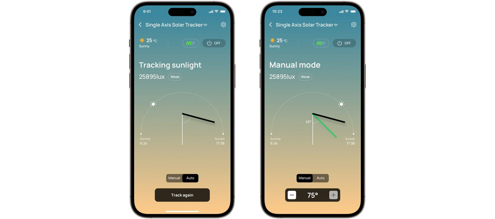 Liga-se e funciona automaticamente ao longo do dia e desliga-se quando o sol se põe ou quando não consegue receber luz solar. Pode monitorizar facilmente o estado de funcionamento do seguidor solar através da aplicação EcoFlow. Em circunstâncias específicas, pode ajustar o ângulo do seguidor manualmente. É altamente eficiente, inteligente e seguro de utilizar.