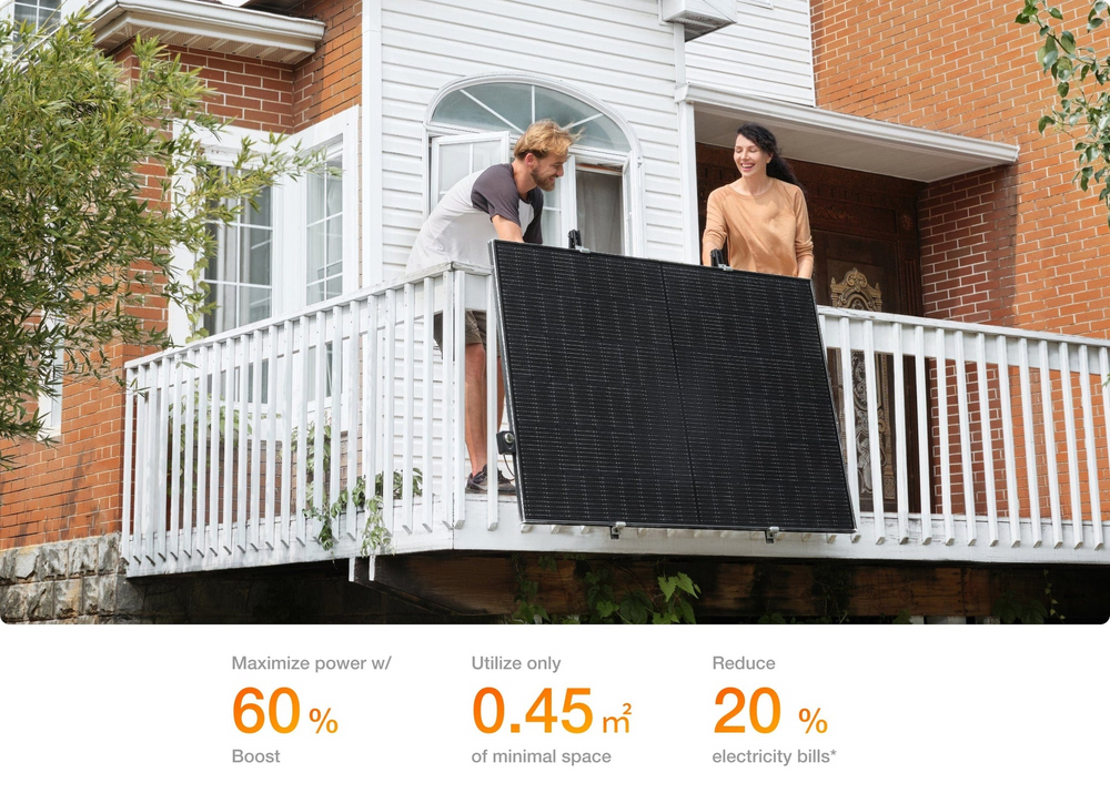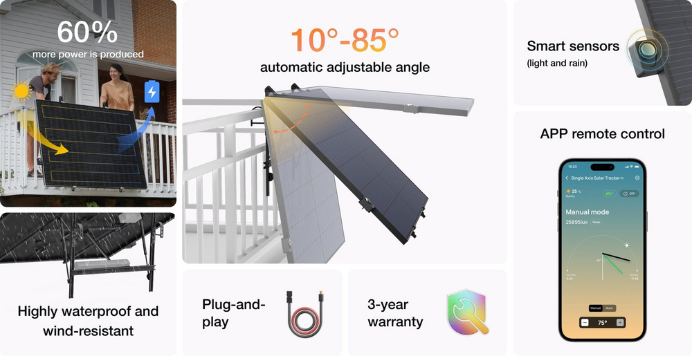 O EcoFlow Single Axis Solar Tracker permite-lhe alcançar a independência energética no espaço mais pequeno, como a varanda de qualquer apartamento ou casa. Ajuda a maximizar a utilização de energia renovável ao seguir automaticamente a luz solar direta de 10 a 85 graus com um único eixo.