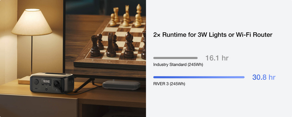 O RIVER 3 revoluciona a eficiência energética, proporcionando o dobro do tempo de funcionamento para aparelhos com menos de 100 W, prolongando a utilização em casa e ao ar livre.