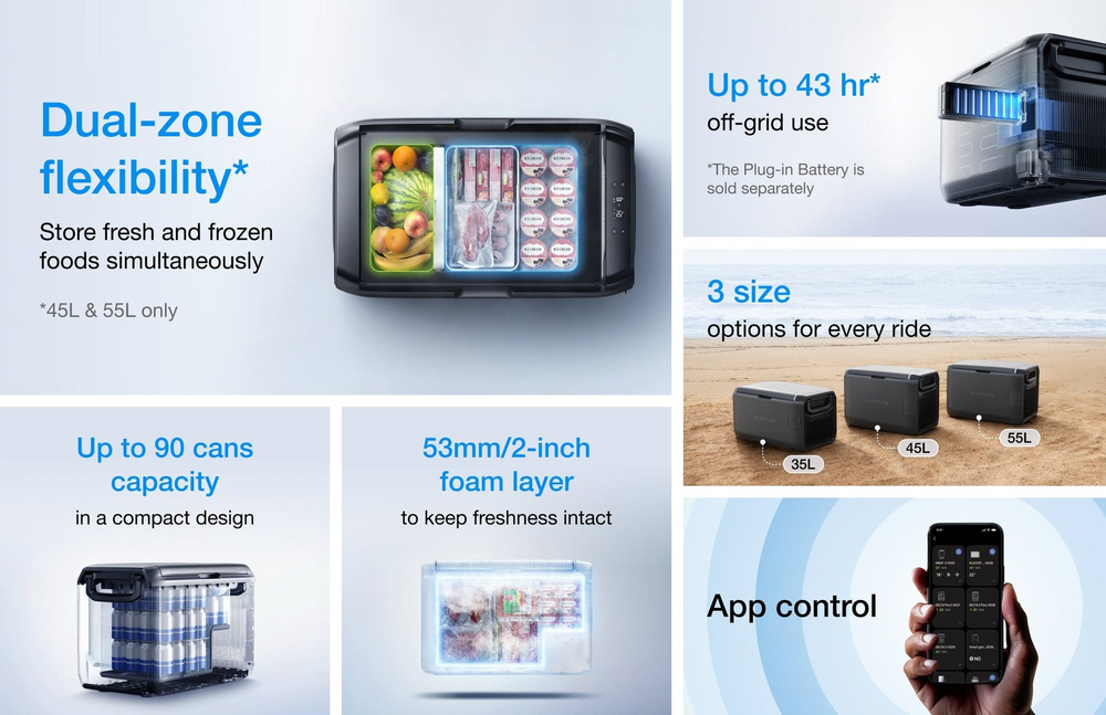 O EcoFlow GLACIER Classic maximiza a eficiência de armazenamento, acomodando 58 latas (35 L), 72 latas (45 L) e 90 latas (55 L) de refrigerante de 330 ml, tudo num formato elegante e que poupa espaço.