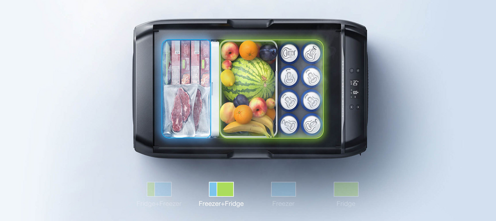 O design de dupla zona (apenas nos modelos de 45 L e 55 L) permite armazenar alimentos frescos e congelados em simultâneo, com uma diferença máxima de temperatura de 22 °C. Sensores avançados mantêm as condições com precisão (±1 °C) para garantir que tudo se mantém perfeitamente fresco.